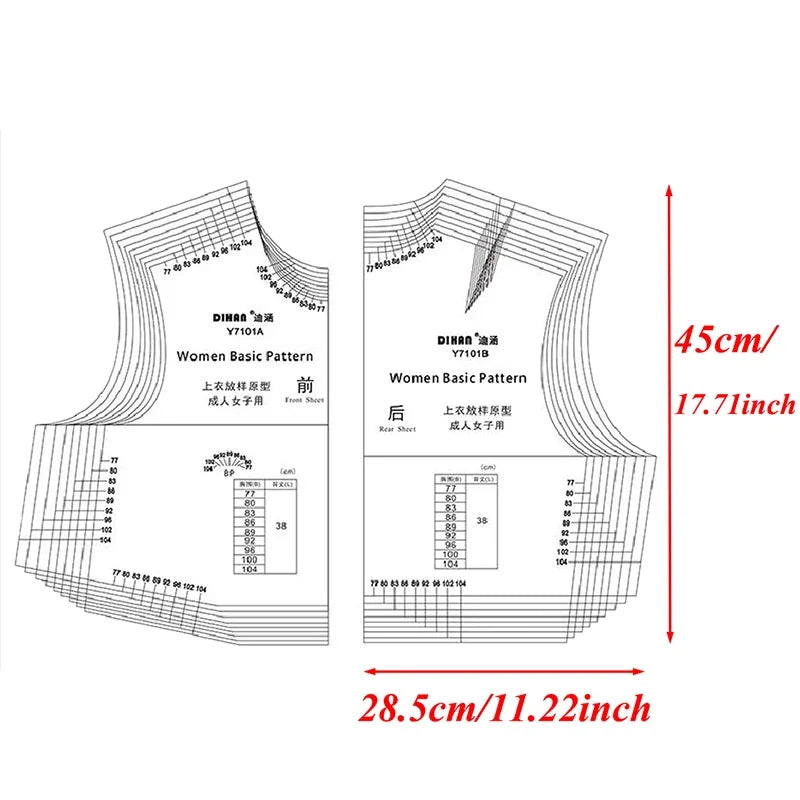 Regla de patrones de plástico reutilizable Clocore con tamaños ajustables (busto de 77 a 104 cm): nueve tamaños en uno, ideal para coser prendas de mujer.