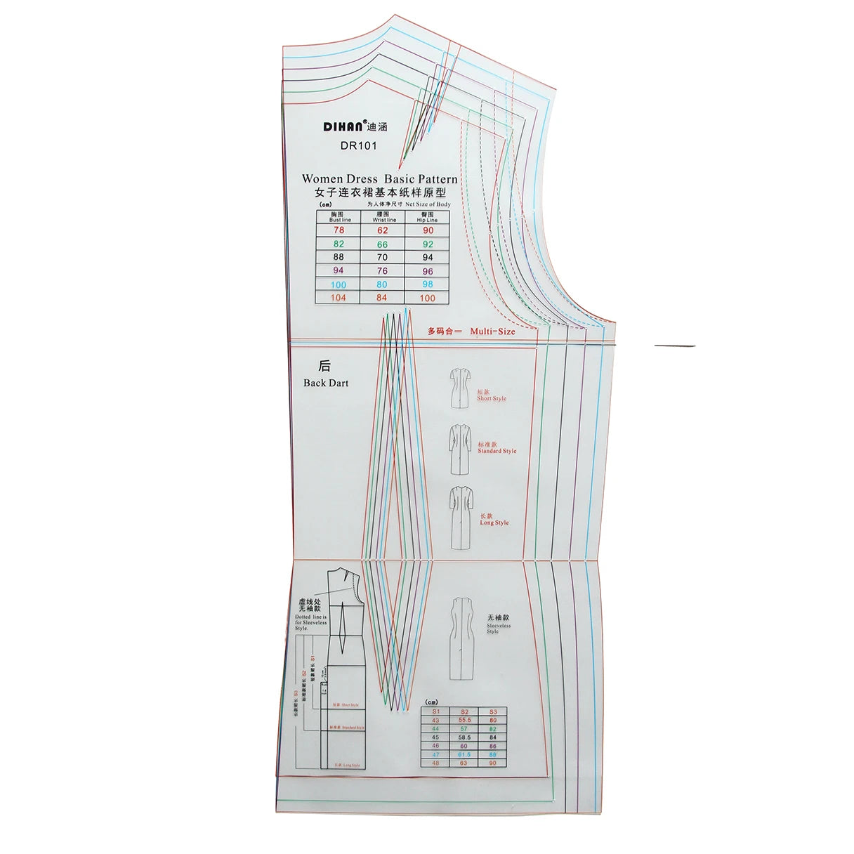 Este Patrón de costura para vestido básico de varias tallas Es una herramienta esencial para crear vestidos a medida fácilmente. Diseñada para medidas de pecho de 78 a 104 cm, cintura de 62 a 84 cm y cadera de 90 a 100 cm, la plantilla proporciona medidas corporales precisas con márgenes de holgura integrados para un ajuste cómodo.